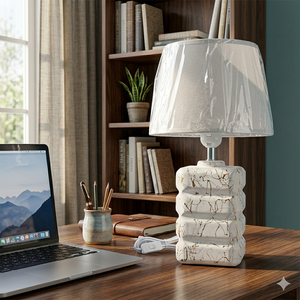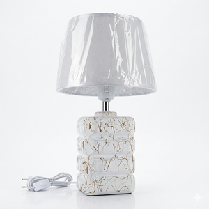 • غطاء المصباح (الشيد): غطاء قماشي منسوج بجودة عالية بلون أبيض مائل للرمادي، مصمم ليوفر إضاءة ناعمة ومريحة للعين.